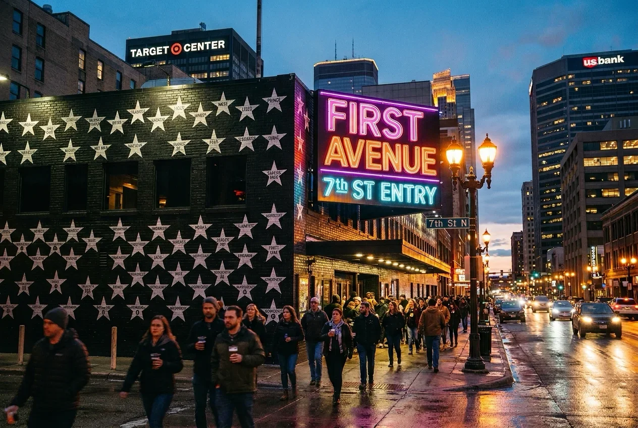 The main floor is general admission standing, which means you want to arrive early if you care about your position in the room. The upstairs bar area has a view down to the stage that works well if you'd rather watch from a higher angle with a drink in hand. Seventh Street in downtown Minneapolis has good options for food and drinks before the show. First Avenue is walkable from both light rail lines and there are parking ramps in the surrounding blocks if you're driving from outside downtown.